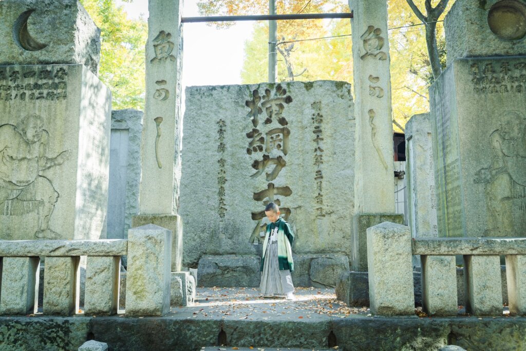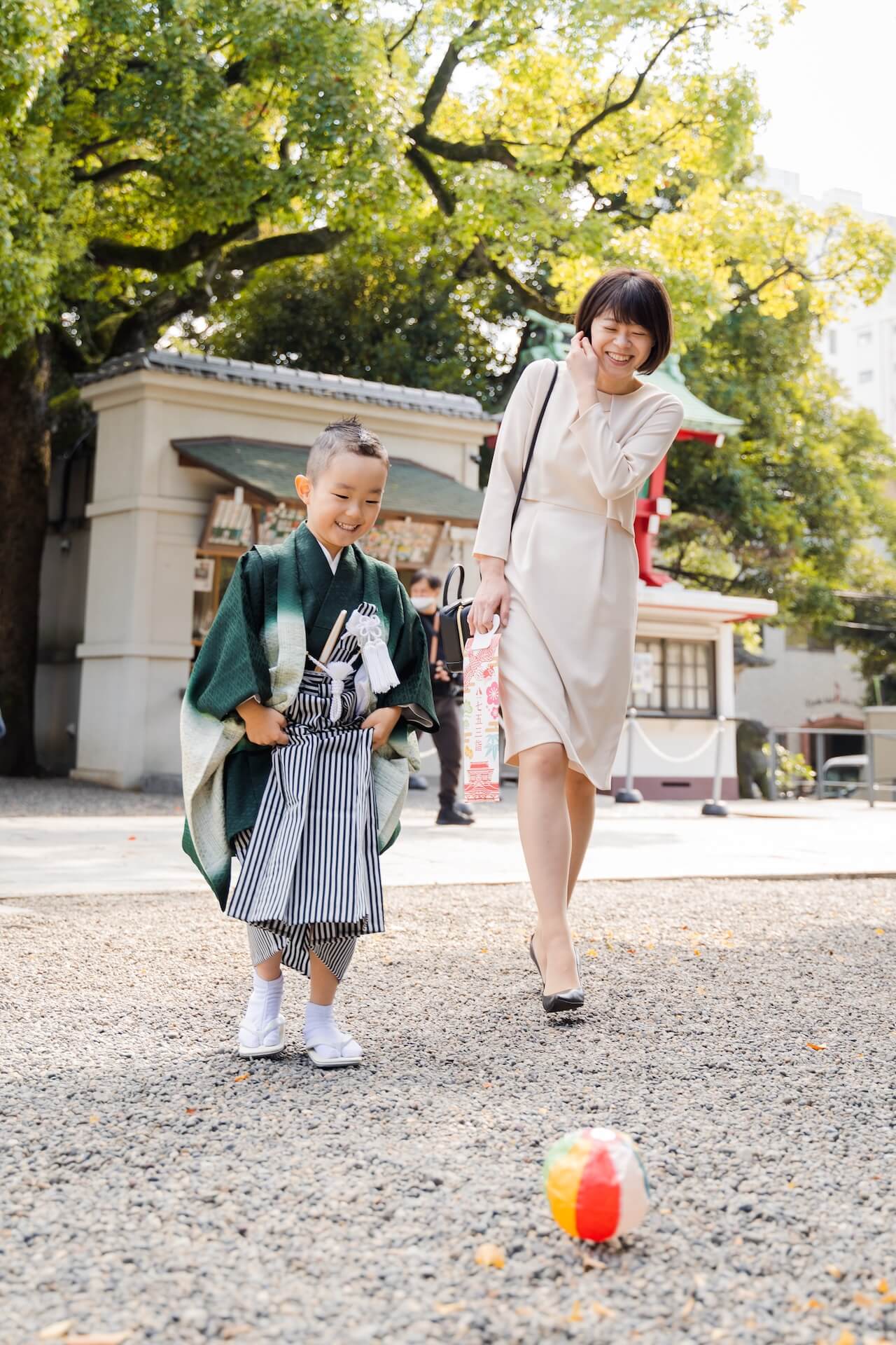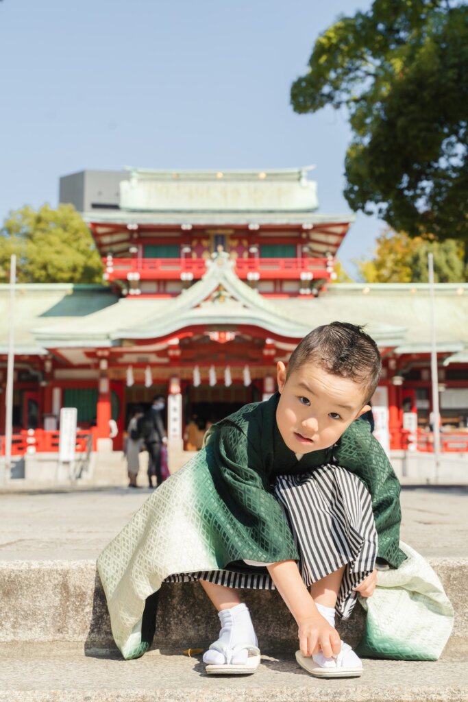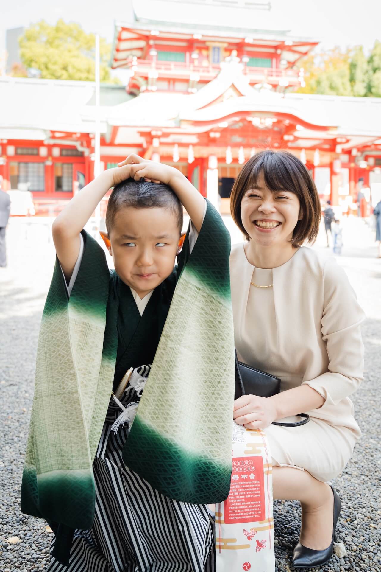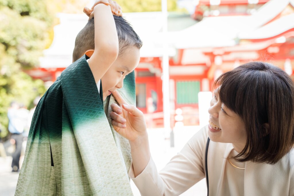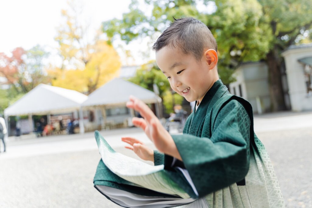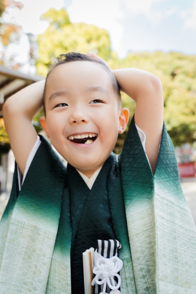 その鮮やかさは、息子くんのグリーンの袴とも相性ぴったり。